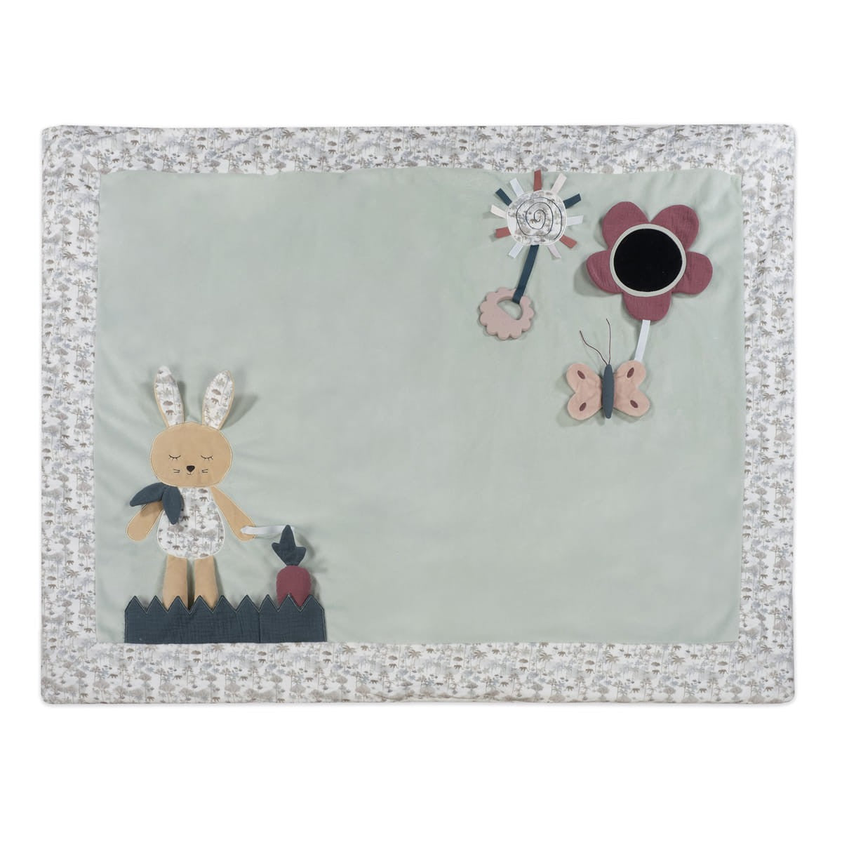 ELa manta de gateo con actividades con conejito en verde es el complemento perfecto para estimular y entretener a tu bebé mientras explora su entorno. Diseñada con detalles encantadores y funciones interactivas.