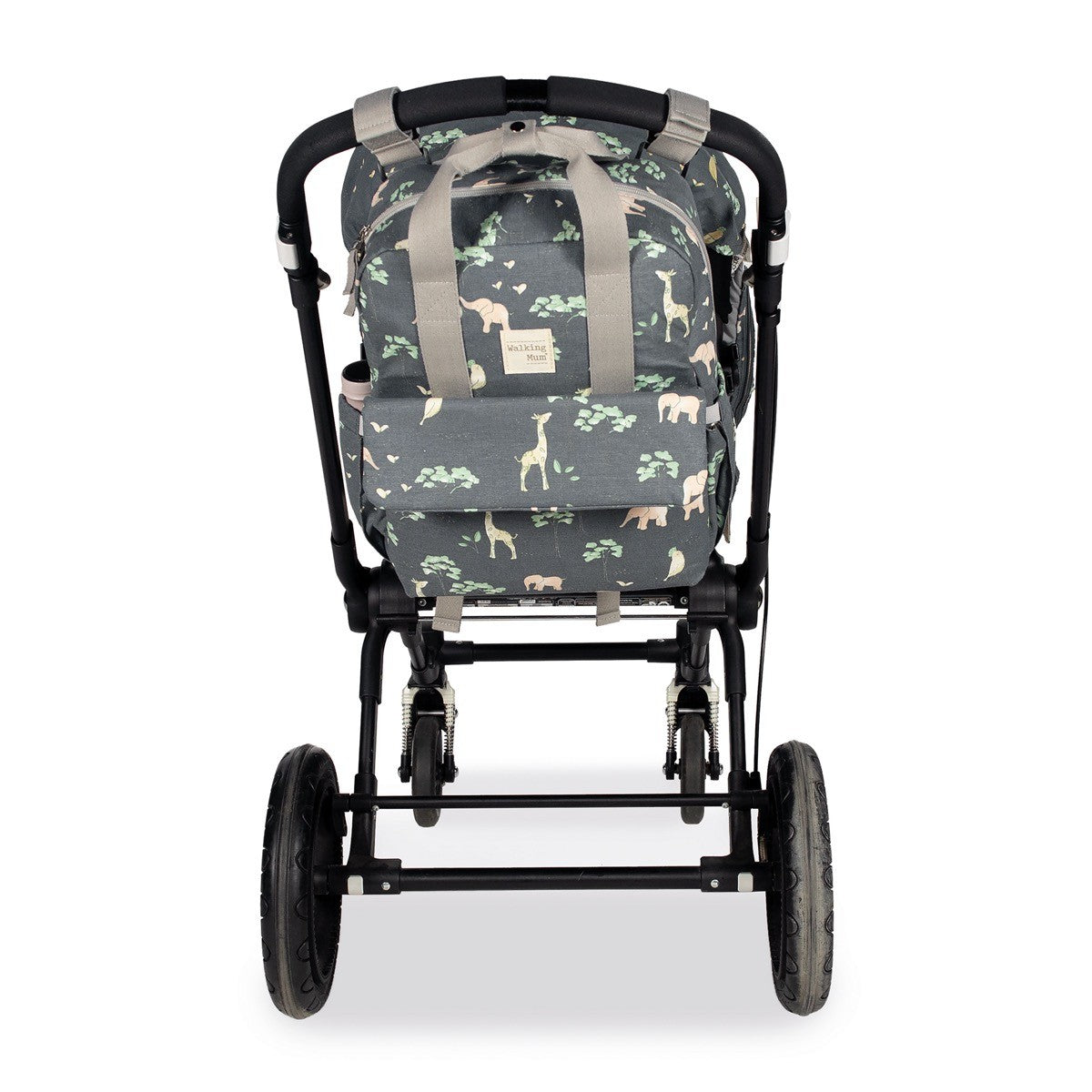 La bolsa Baobab en estampado sabana para silla de paseo es un modelo multifunción muy ligero, resistente y de gran capacidad para llevar todo lo necesario en el paseo del bebe.