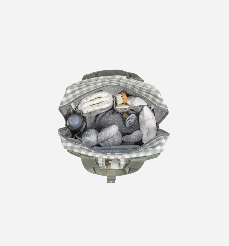 Tiene bolsillos para guardar los biberones y mantenerlos seguros, elásticos para colocar cubiertos, para las toallitas húmedas, también tiene un funda para la botella de agua y otros más.