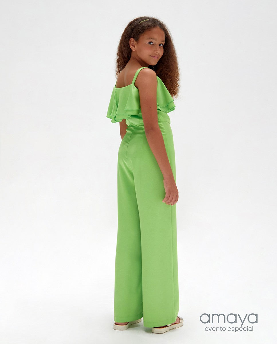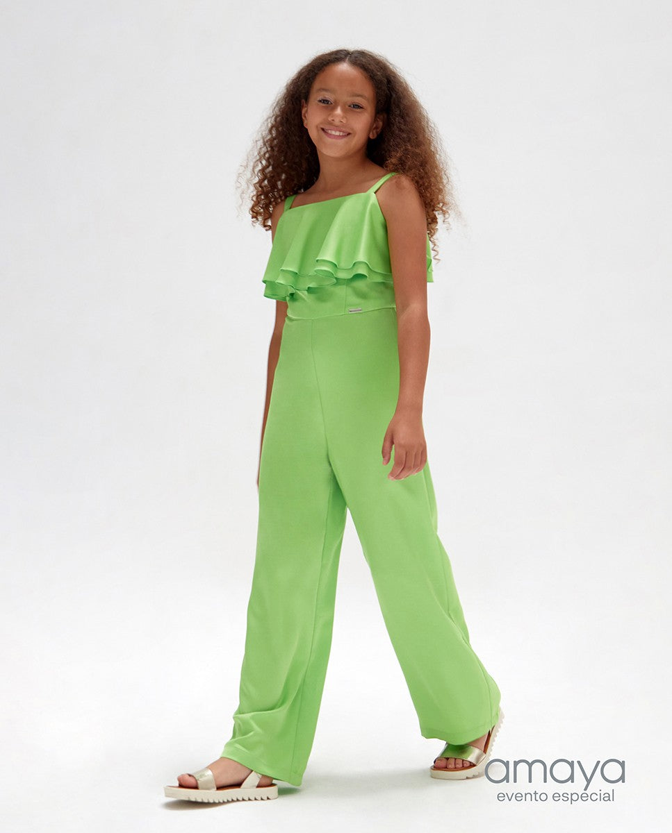 Este mono largo para niña juvenil de ceremonia forma parte de la exclusiva colección Evento Especial de Amaya Fashion for Kids, reconocida por su elegancia y calidad. Confeccionado en tejido creepe, ofrece una caída suave y un ajuste cómodo que realza la figura juvenil. Sus mangas de volante aportan un toque de sofisticación y dinamismo al diseño, mientras que el aplique decorativo en la cintura enmarca sutilmente la silueta. Ideal para ocasiones formales, este mono combina estilo y funcionalidad, y ha sido fabricado en España garantizando un acabado cuidado y materiales seleccionados para una prenda duradera y confortable.