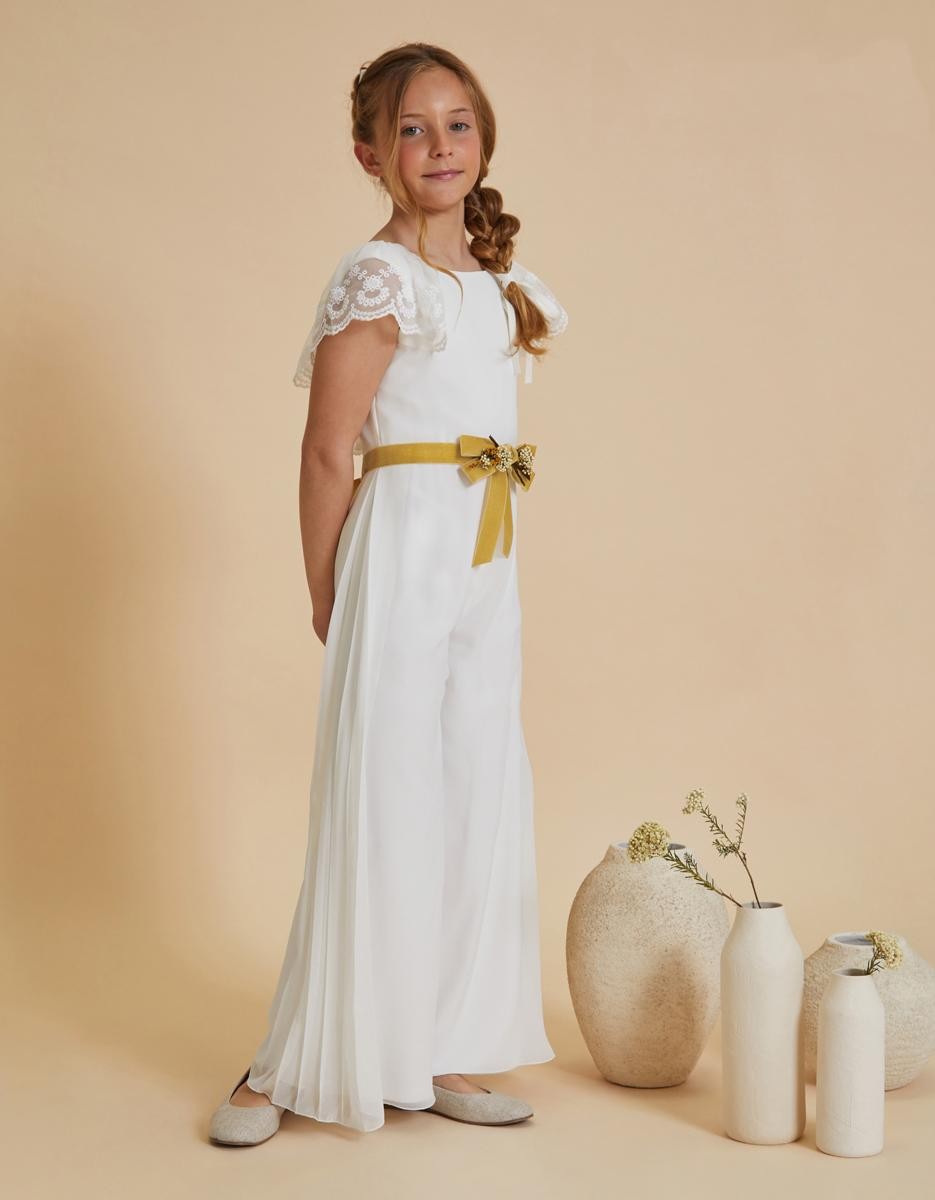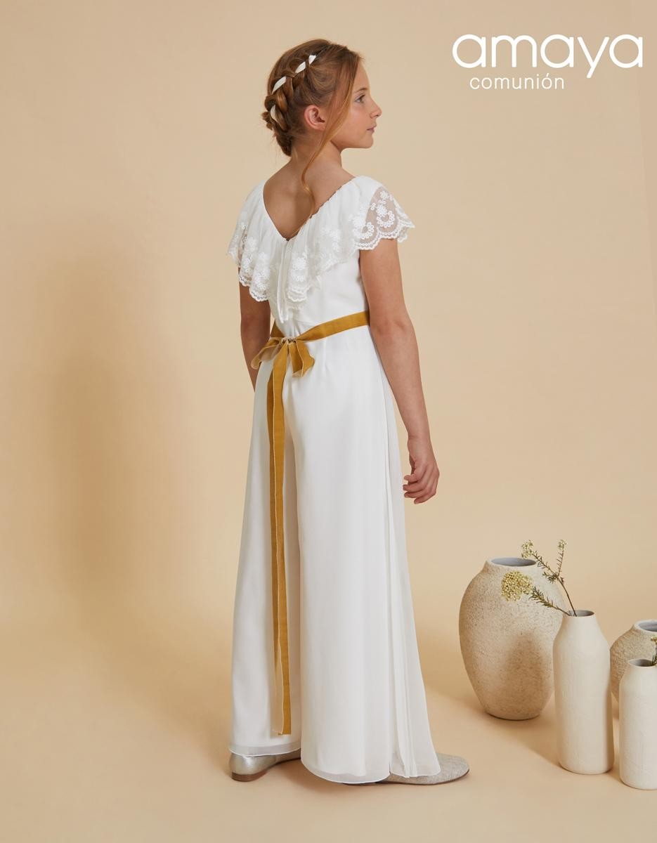Elegante mono de comunión de claro carácter romántico de la nueva colección 2025 de la firma Amaya Fashion for Kids realizado en tejido de tul .