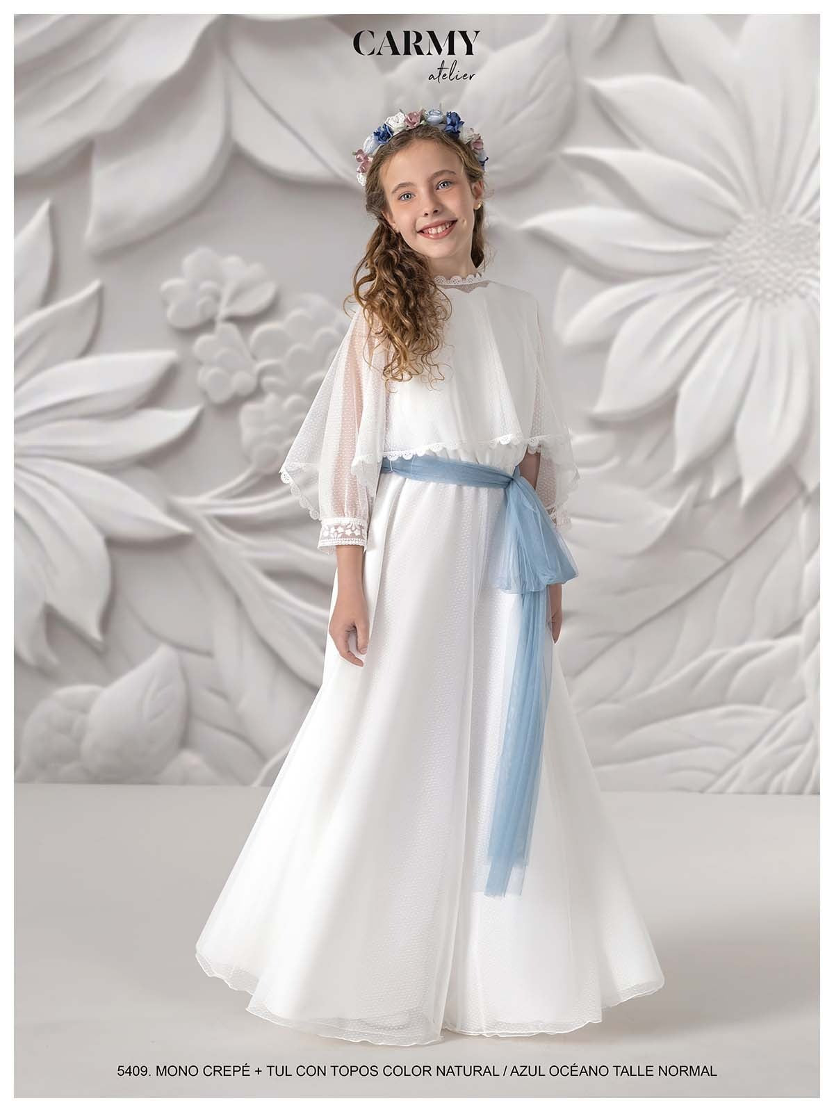 Elegante mono de comunión realizado en tejido de crepé con capelina en tul de plumeti.