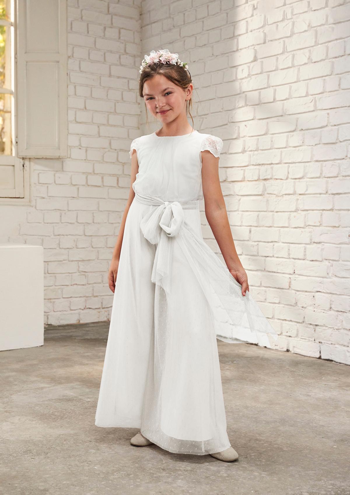 El mono de comunión Amaya 636032, parte de la exclusiva colección 2026 de Amaya Fashion for Kids, combina un diseño romántico con una confección impecable en tejido de tul.