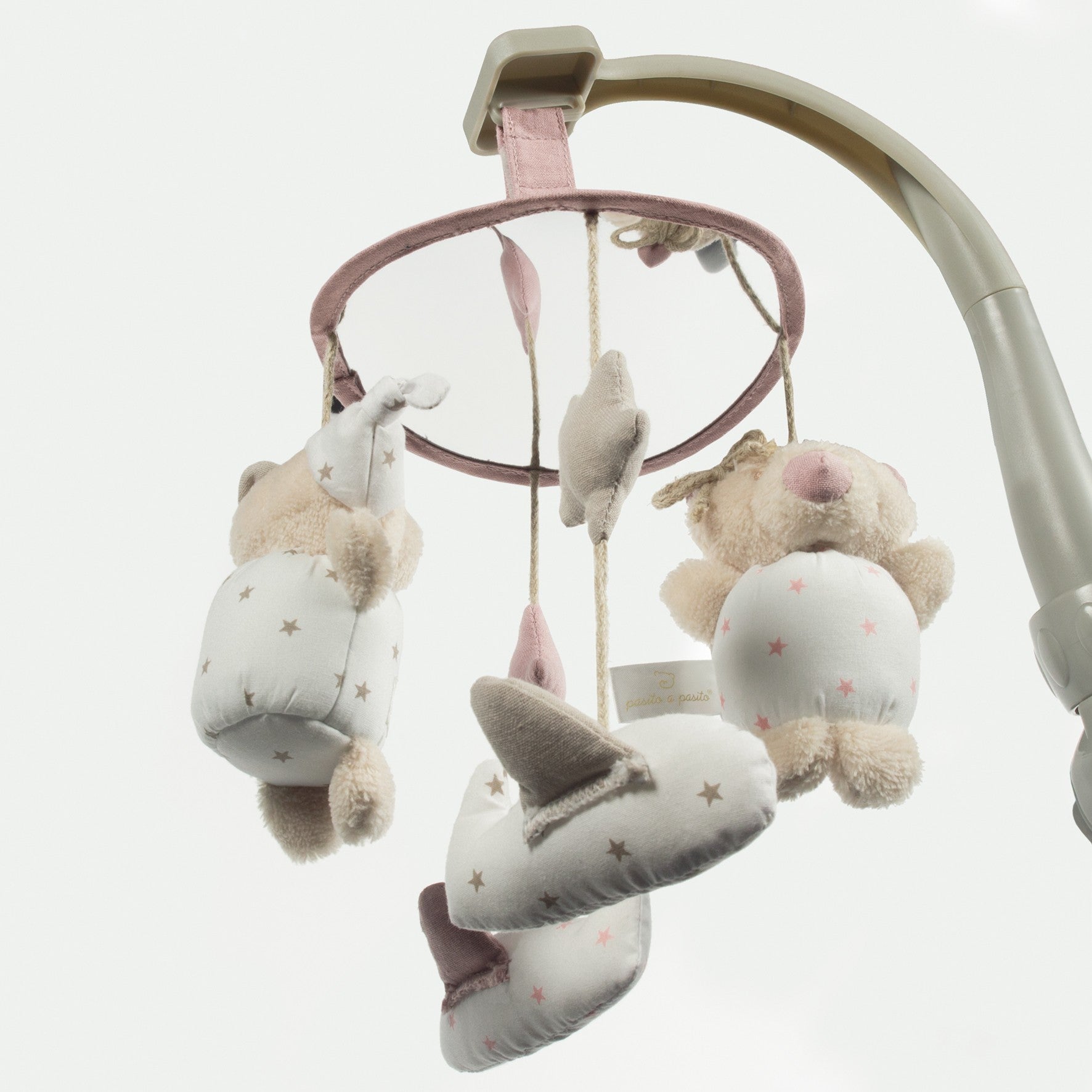 Móvil actividades para la cuna con osito y avión sonajeros y estrellas.