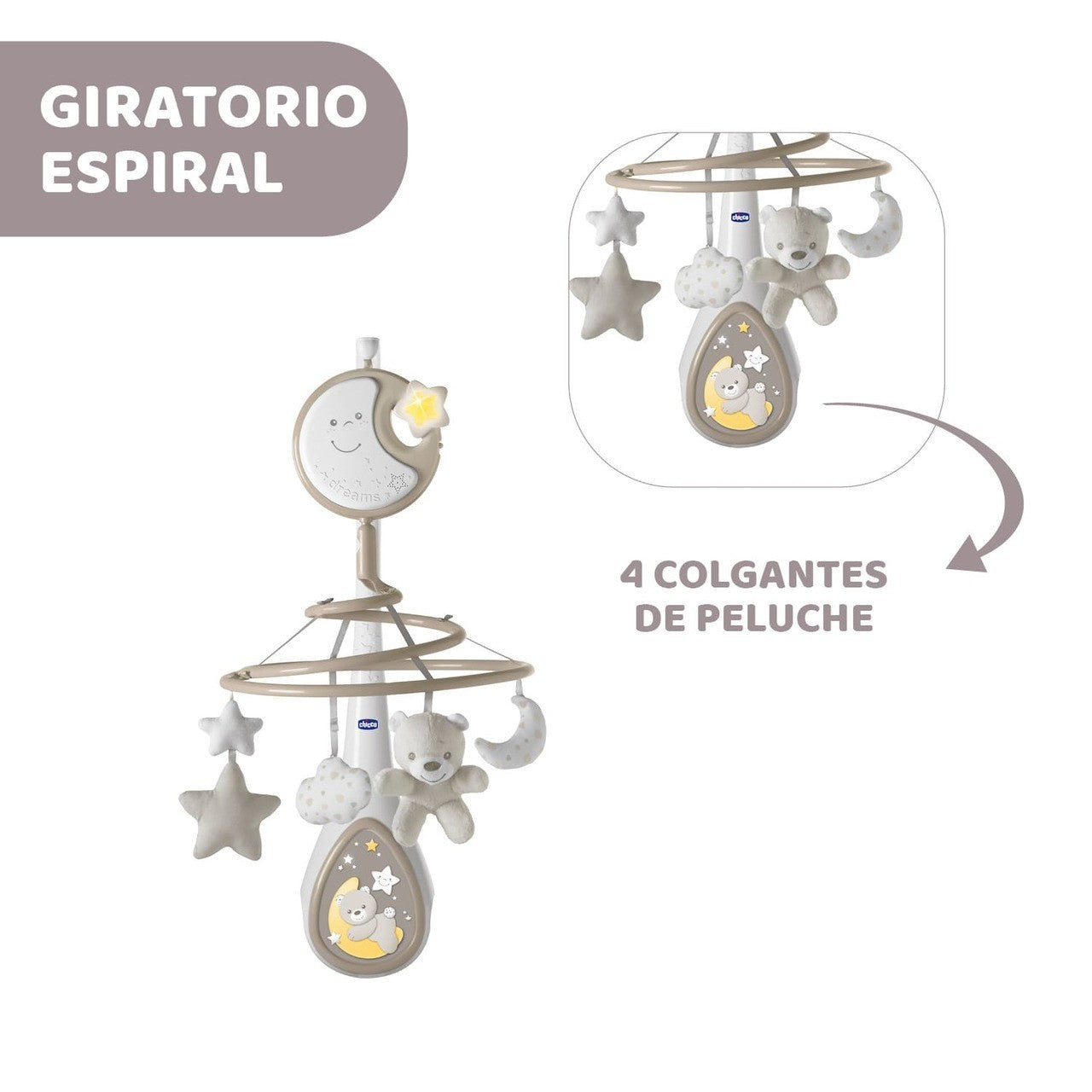 El móvil de cuna Next2Dreams es el primero móvil con juguetes colgantes y sonidos blancos compatible con la cuna de colecho Next2Me de Chicco, pero también con la mayoría de cunas de madera existentes en el mercado.