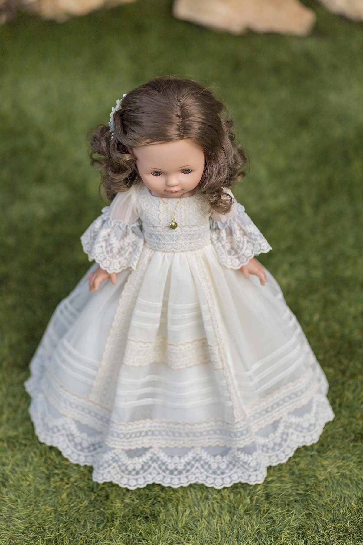 En nuestro taller confeccionamos el mismo vestido de Comunión, que hayáis elegido para vuestra hija dentro de nuestras colecciones, a nuestras Muñecas personalizadas.