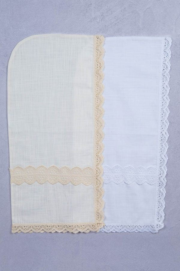 Pañuelo para la ceremonia del bautismo en lino con bordados con puntillas. Con forma de capucha para el momento de la ceremonia.