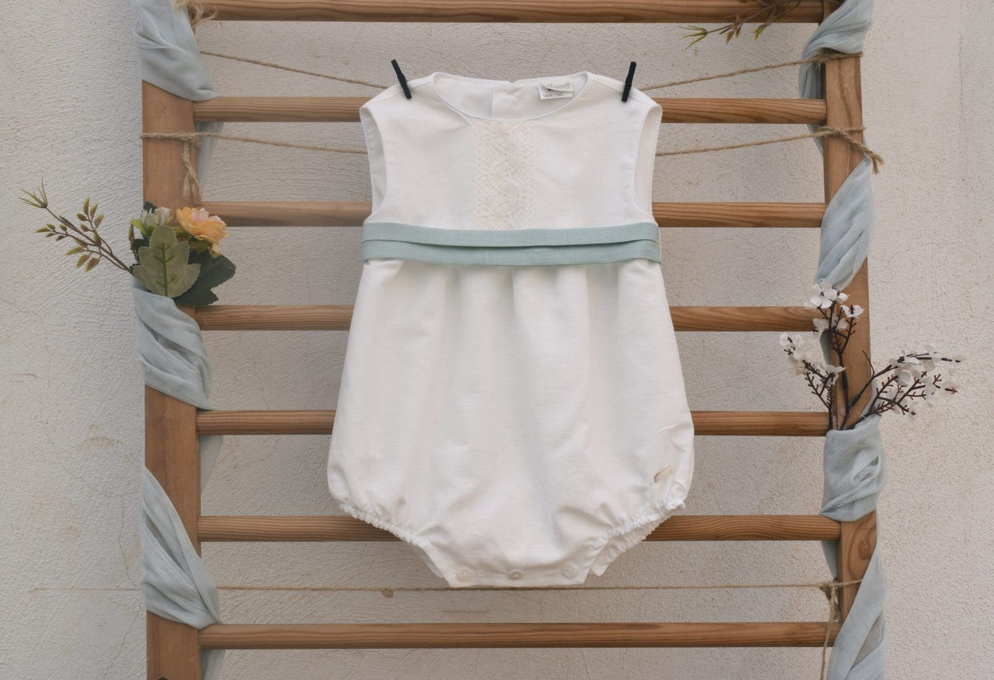 Un encantador pelele de lino con detalles de puntilla bolillo