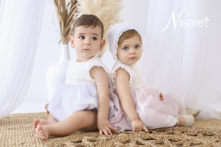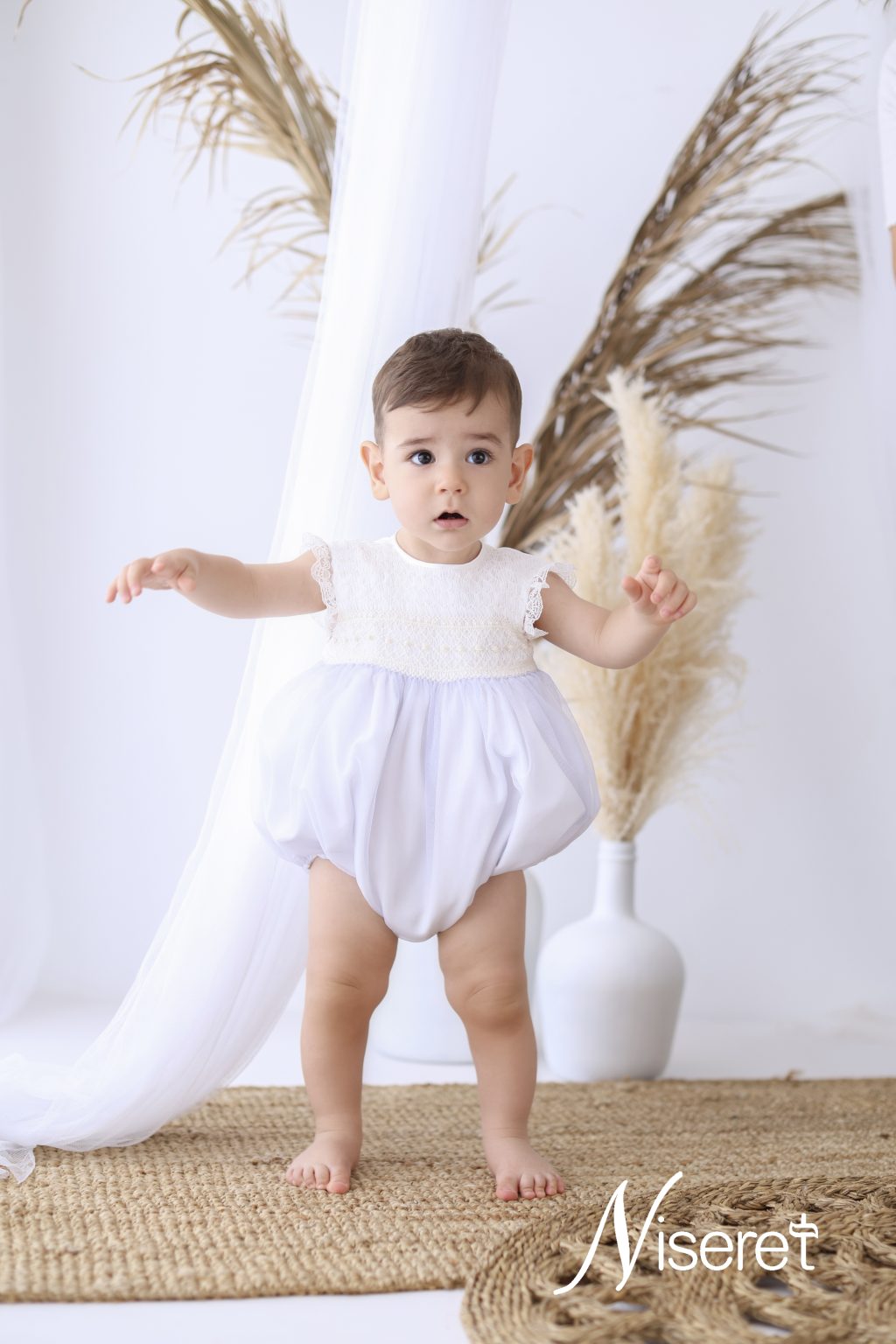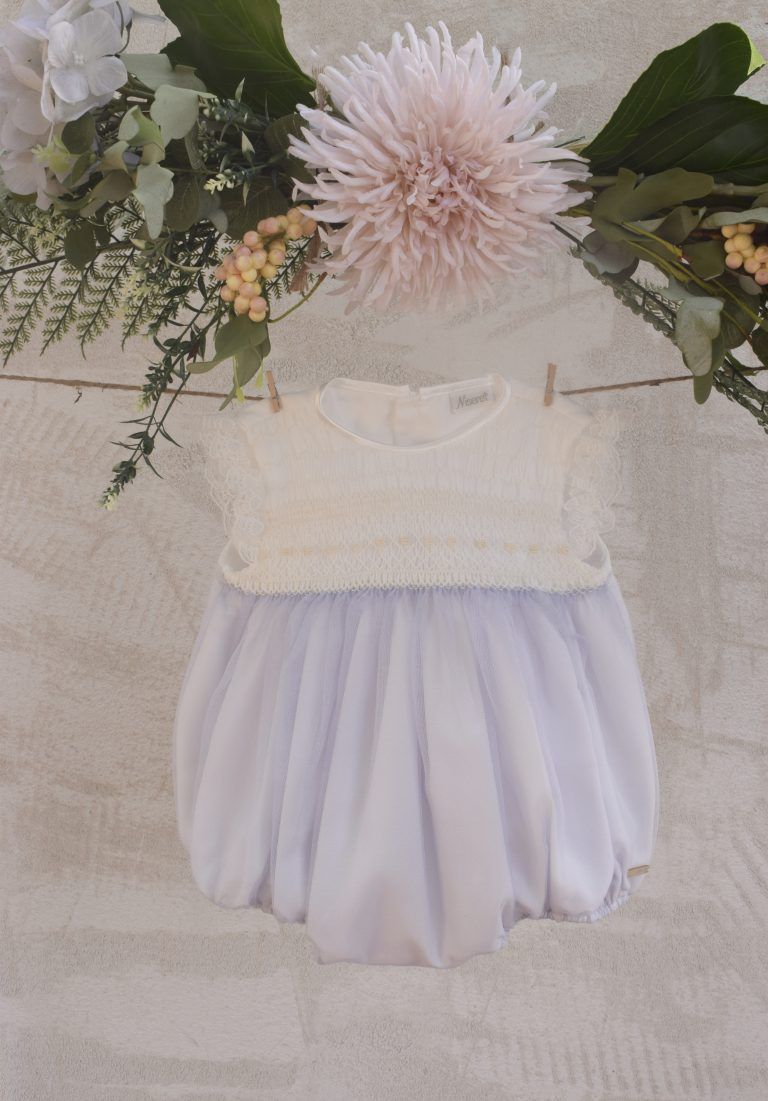 Delicado pelele de organza con cuerpo adornado con un elegante bordado a mano en nido de abeja. Un diseño único y artesanal.