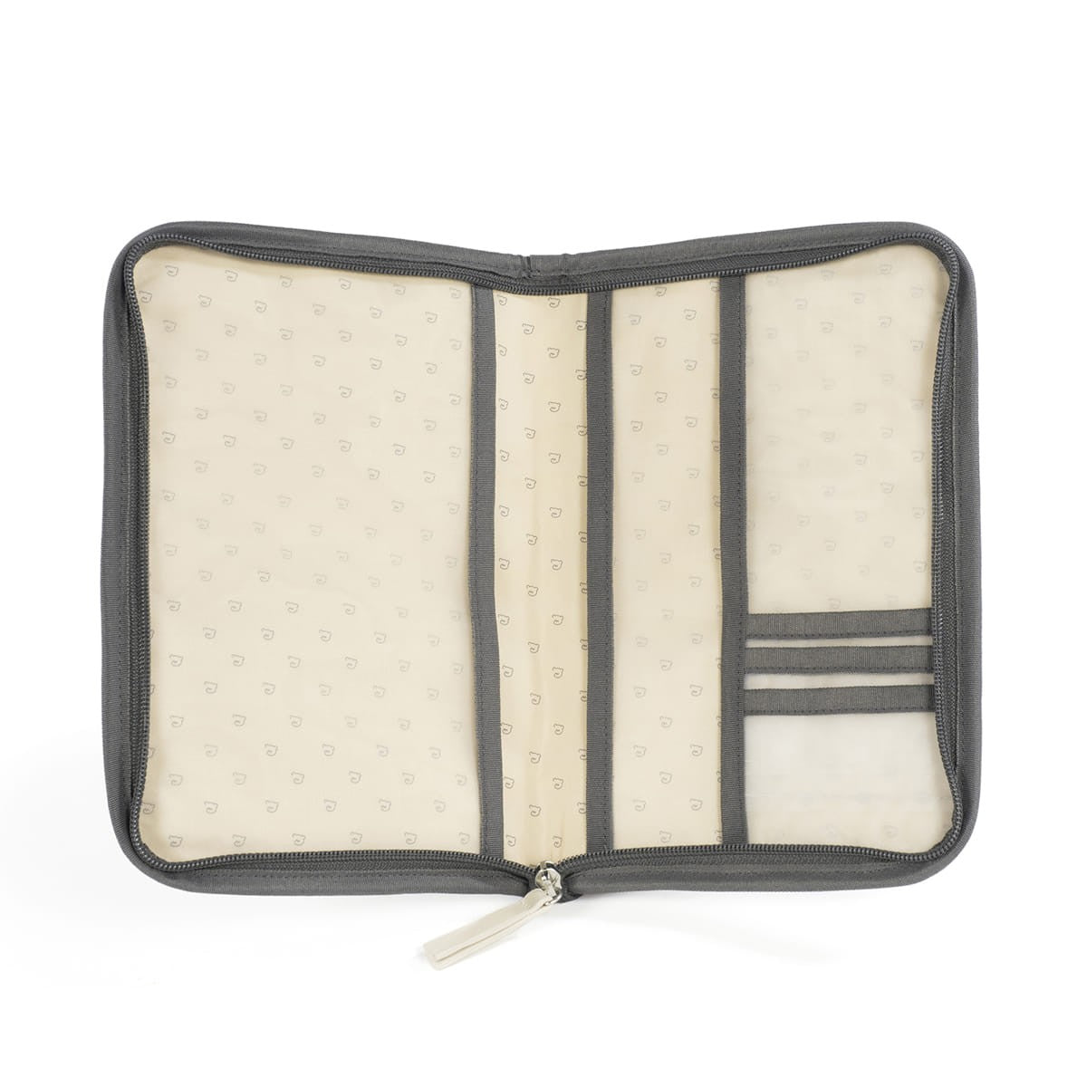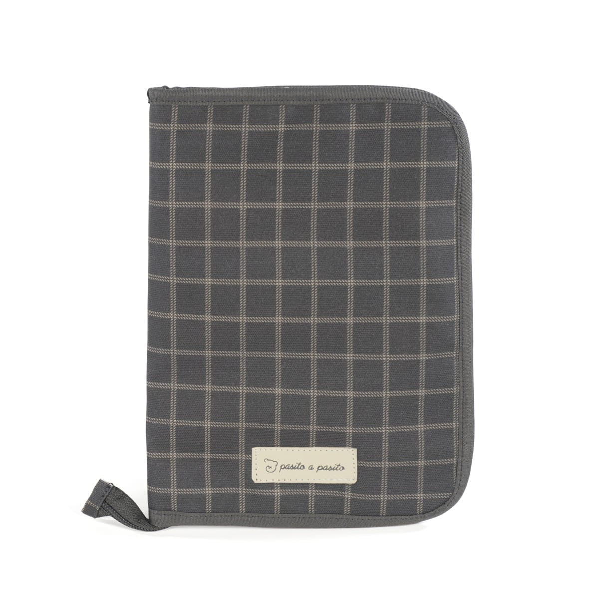 Este moderno y bonito libro de nacimiento para bebé Tartan en cuadro gris de Pasito a pasito elaborado en resistente algodón con un tratamiento waterproof es un funcional portadocumentos de diseño a juego con la bolsa de maternidad.