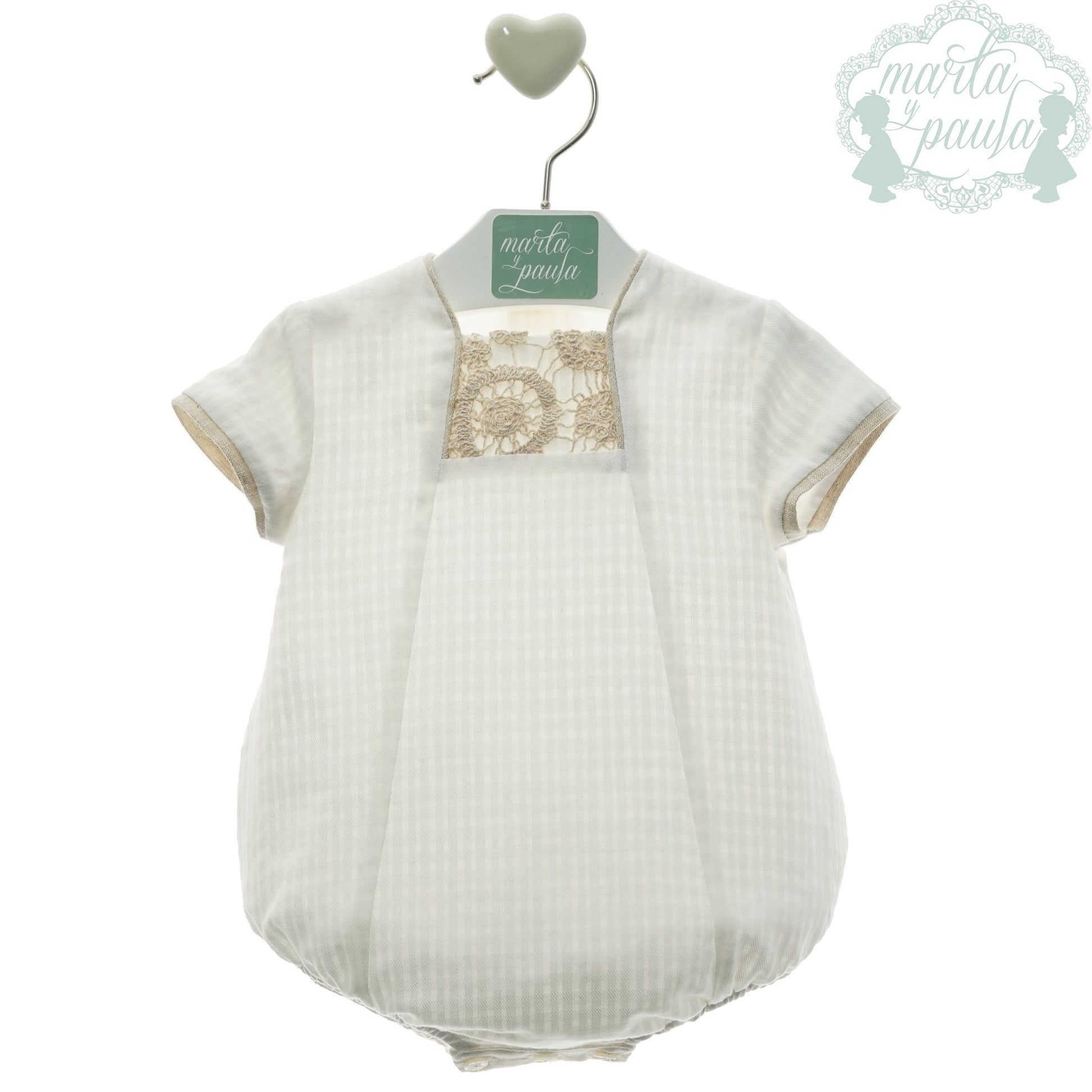 Pelele de niño en tonos naturales y tierra. Elegante, dulce y con gran sensibilidad.