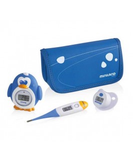 Thermokit de Miniland es un conjunto profesional que incluye tres termómetros digitales diseñados para diferentes necesidades en el cuidado del bebé. El termómetro corporal presenta una punta suave y flexible, proporcionando mediciones rápidas y fiables con alertas sonoras y visuales de fiebre para un control preciso de la salud. El termómetro de baño mide eficientemente la temperatura del agua y del ambiente, con alertas de temperatura fuera de rango, garantizando baños seguros y confortables; además, cumple con los estándares de seguridad de juguetes. El termómetro chupete, resistente al agua y con forma anatómica, ofrece una medición rápida y cómoda, imitando un chupete convencional para facilitar su uso con máxima comodidad. Todos los dispositivos cuentan con apagado automático para optimizar la duración de las pilas y se guardan en un práctico neceser con cremallera, facilitando su conservación y transporte seguro. Este set es la herramienta ideal para realizar un control exhaustivo de la temperatura del bebé en diferentes situaciones de forma sencilla y fiable.