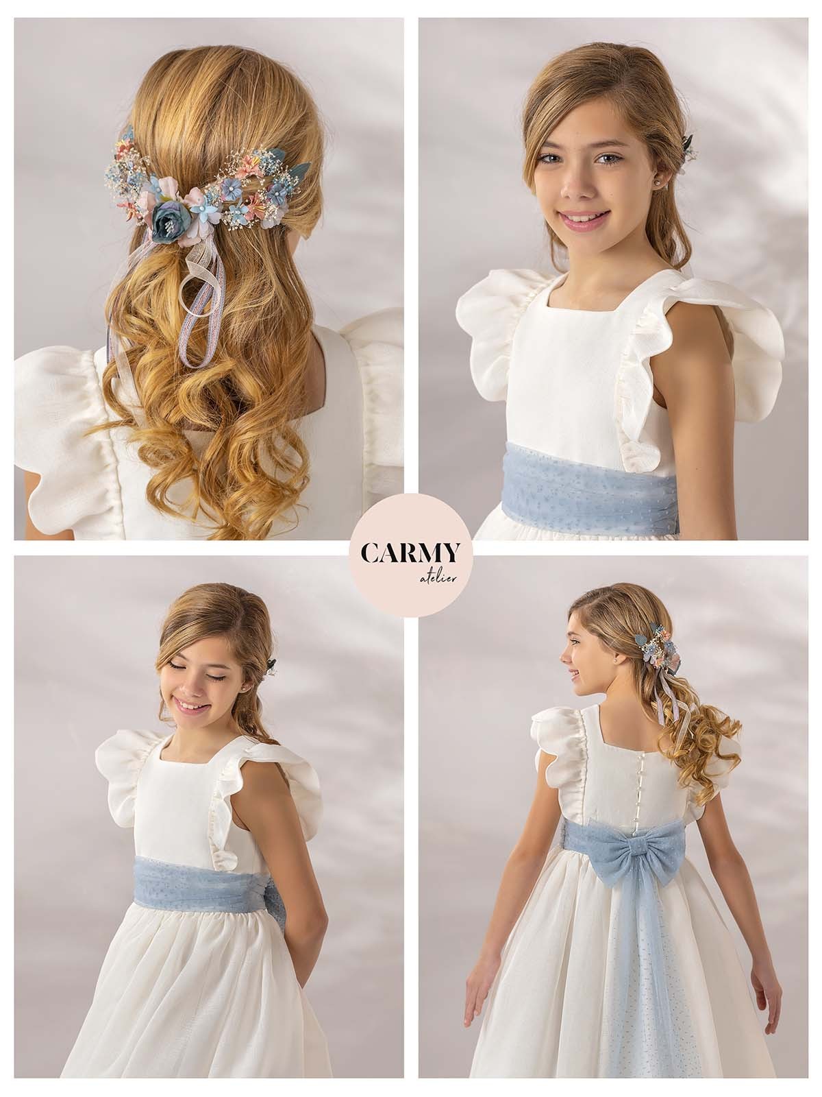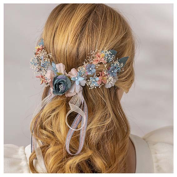 Tocado de comunión decorado con flores hechas a mano en tonos rosas y azules.