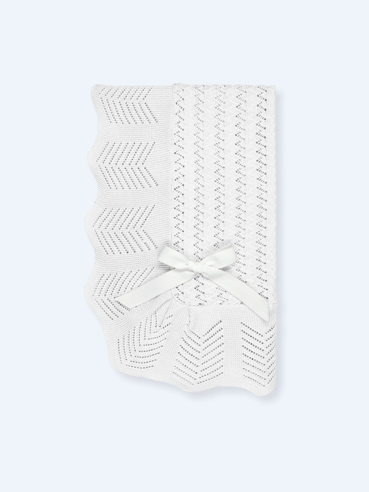 Mantita en punto ideal en perlé para los meses más calidos. Decorada con tira bordada.
