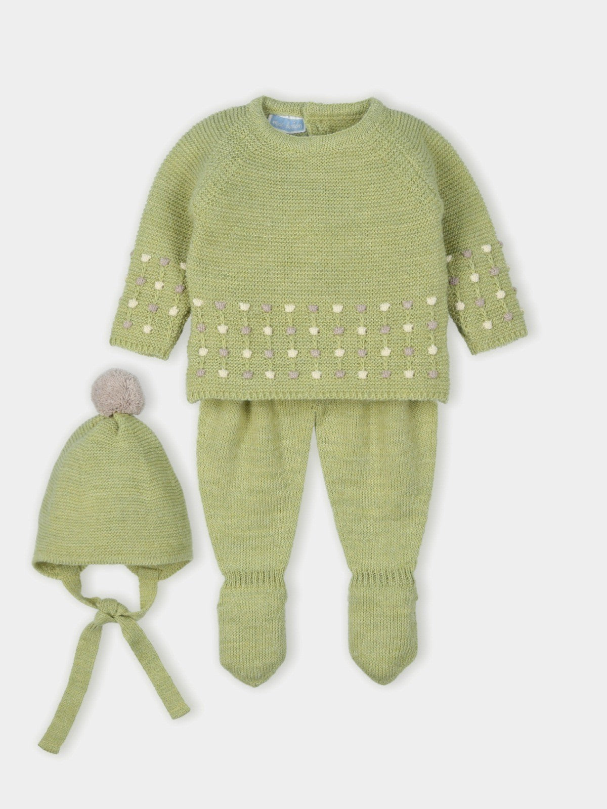 Este conjunto de invierno para bebé de tres piezas está diseñado para ofrecer comodidad, calidez y estilo en los días fríos. El jersey de punto, abrochado cuidadosamente en la espalda con botones, facilita el cambio y garantiza un ajuste seguro y cómodo. Los delicados bodoques que adornan el jersey aportan un detalle sofisticado y artesanal. El pantalón incluye pie integrado, asegurando que los pies del bebé estén protegidos sin necesidad de calcetines adicionales, ideal para mantener la temperatura óptima. El gorrito rematado con un pompón combina funcionalidad y ternura, protegiendo la cabeza del frío con un toque encantador. Todo el conjunto está confeccionado en España bajo estrictos controles de calidad. Un equilibrio perfecto entre diseño, confort y protección para los primeros meses del bebé.