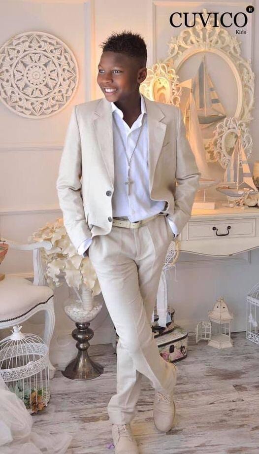 Americana color arena de dos botones con la corbata y el pañuelo en azul marino.