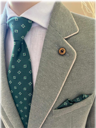 Americana color verde oliva de dos botones con la corbata y el pañuelo de la solapa a juego.
