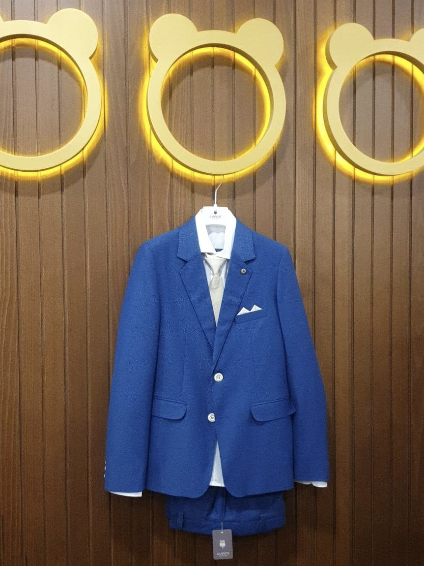 Americana color azul tinta de dos botones con ribetes a juego con la corbata y el pañuelo.