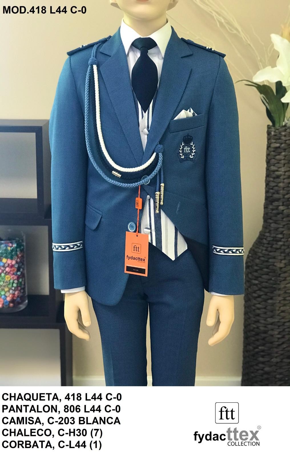 Americana color azul tinta con el cuello de solapa y detalles en plata sólo en cuello. Chaleco estampado y corbata. Galones en azul y escudo bordado a juego en la chaqueta.