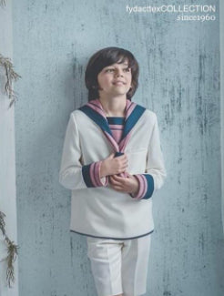 Casaca en crudo, con la corbata en color rojo lino con detalle en azul marino, y los puños a juego.