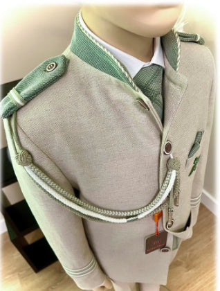 Americana color arena con el cuello mao, chaleco y corbata a juego. Galones plateados con detalle en verde oliva y escudo bordado a juego en la chaqueta. Detalles y botones a juego.