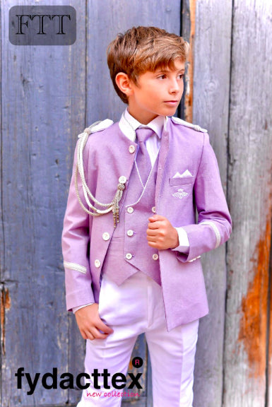 Americana color malva con el cuello mao y detalles en color nata, chaleco y corbata a juego. Galones y escudo bordado a juego en la chaqueta. Detalles y botones a juego