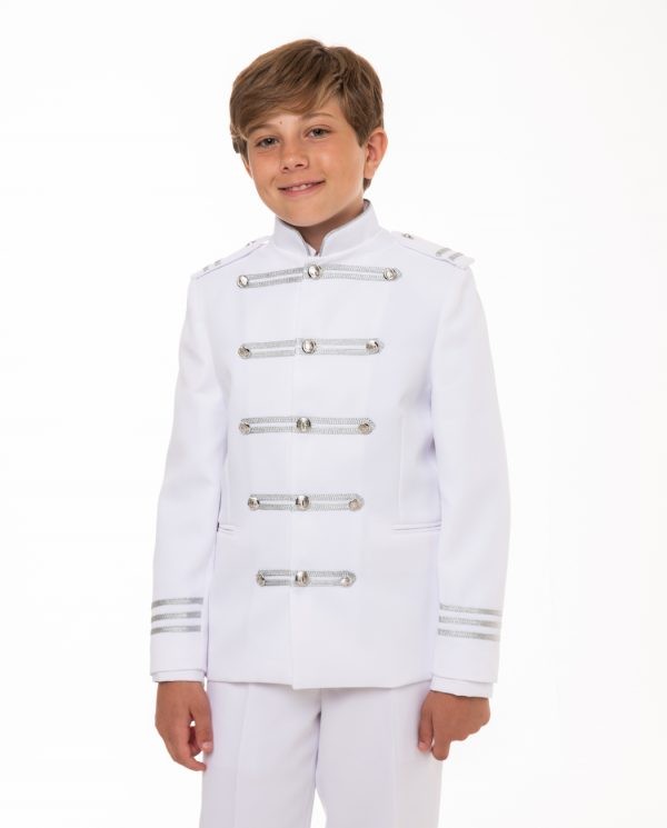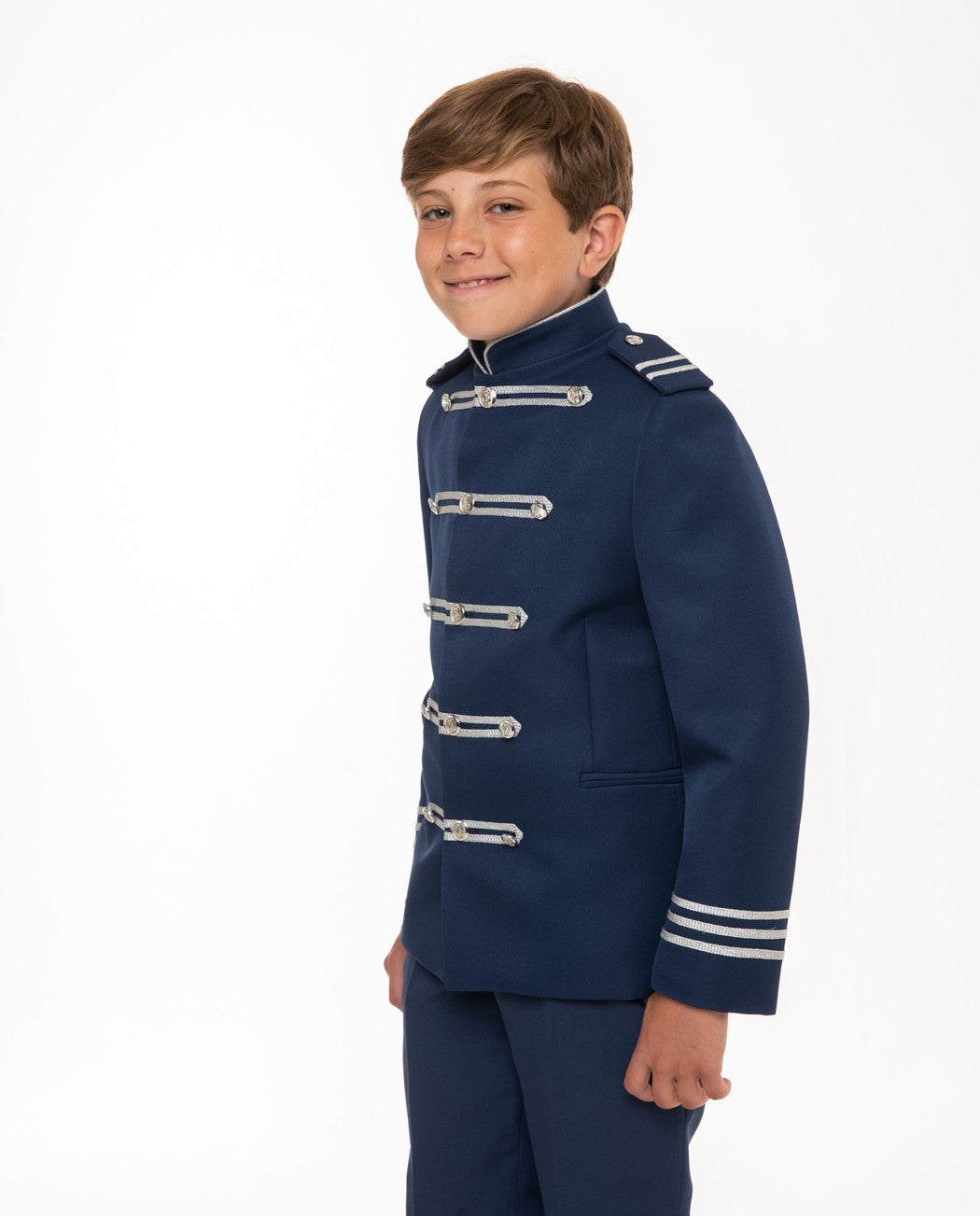 Americana color azul tinta con el cuello mao y detalles en plata. Chaleco y corbata en tonos plateados. Galones en plata hechos a mano y cosidos por toda la parte delantera. Gemelos, detalles y botones a juego.