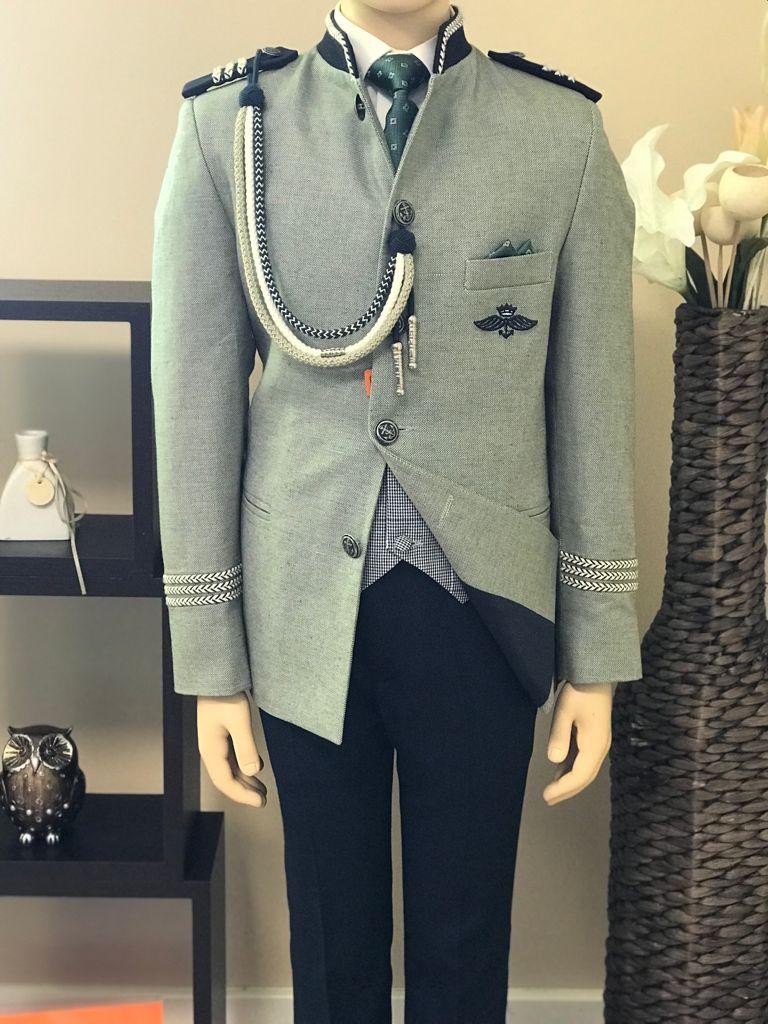 Traje almirante de 5 piezas que incluye chaqueta, chaleco, camisa, corbata y pantalón. La americana es verde con cuello mao y detalles plateados, mientras que el chaleco y la corbata presentan un diseño estampado. La chaqueta incorpora galones azules y un escudo bordado a juego. El pantalón es azul marino. Producto fabricado en España con tejidos de alta calidad y acabados artesanales.