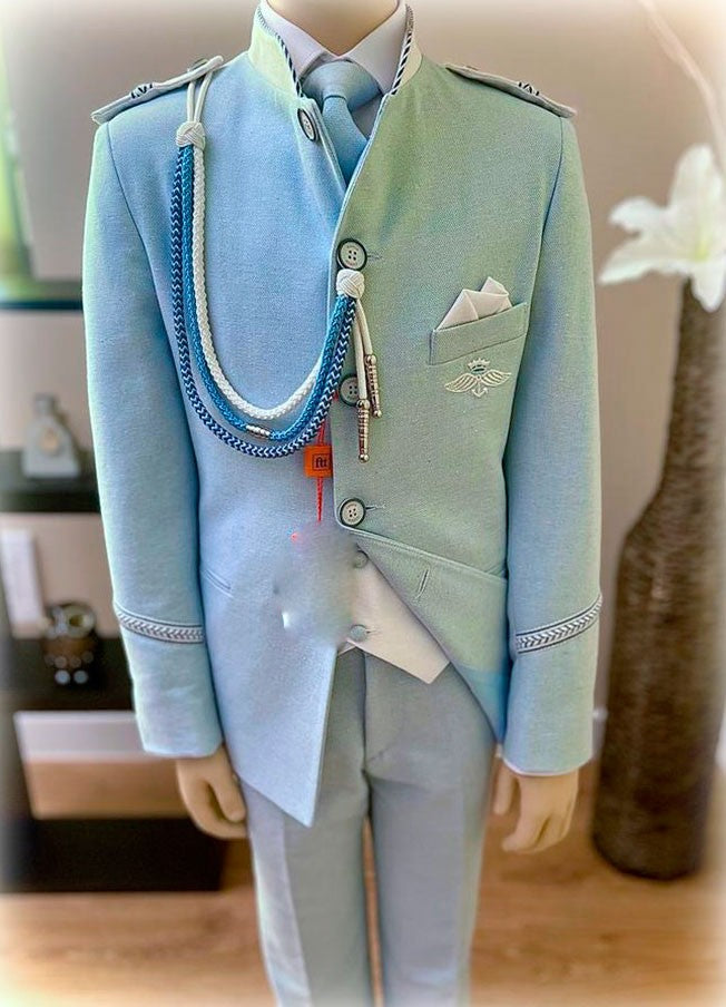 Americana color azul cielo con el cuello mao, chaleco en crudo y corbata azul cielo. Galones con detalle en plata y azul y escudo bordado a juego en la chaqueta. Pañuelo en el bolsillo de la chaqueta a juego.