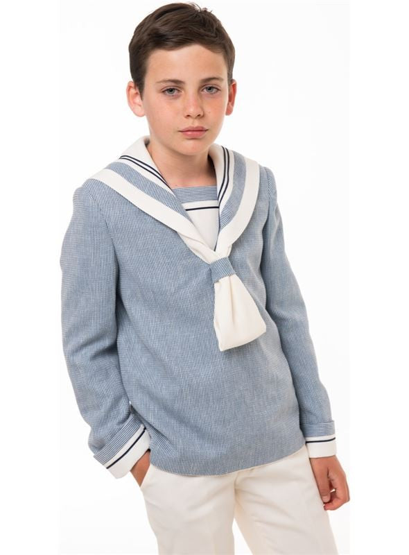 Casaca en rayas azul clarito. Con timón bordado en tejido de la manga a contraste en color crudo con detalle en azul, y corbata en color crudo.
