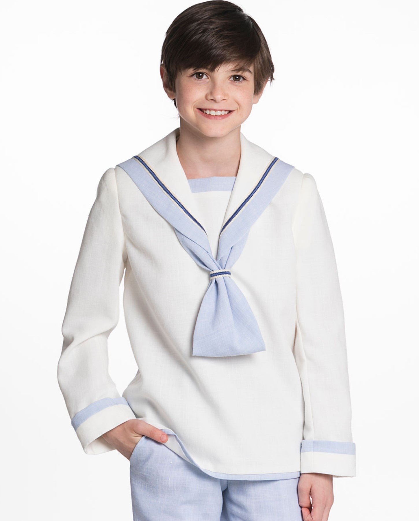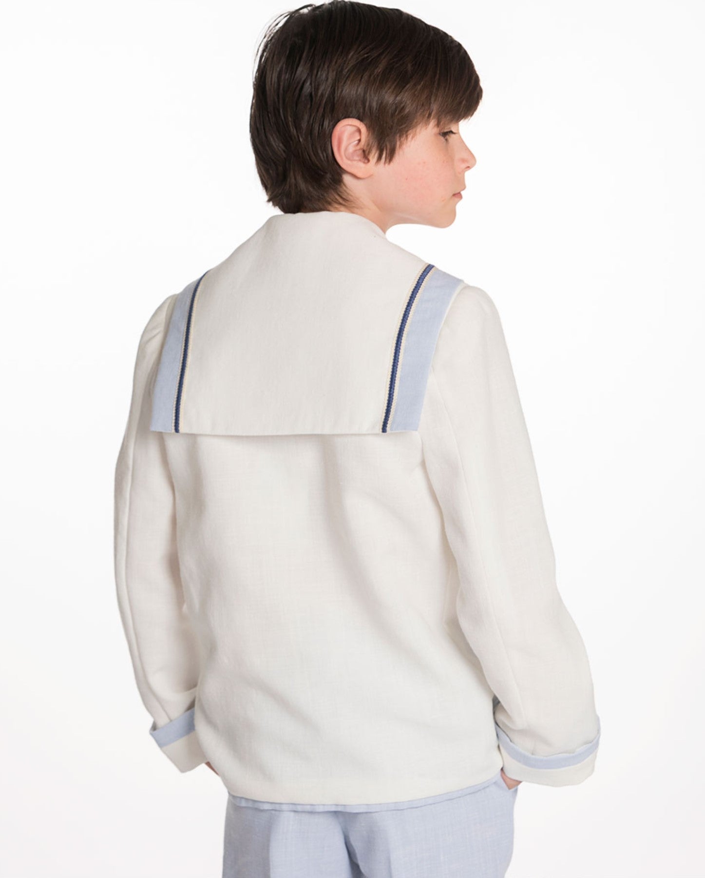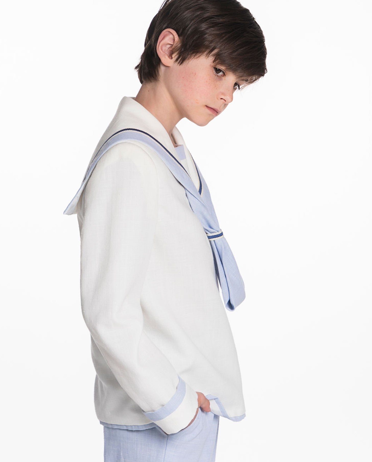 Casaca en lino color blanco crudo, con corbata a contraste en color celeste con detalle en crudo.