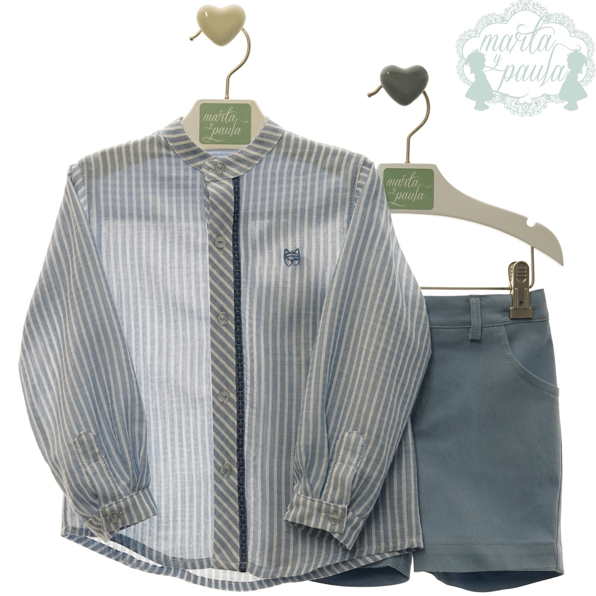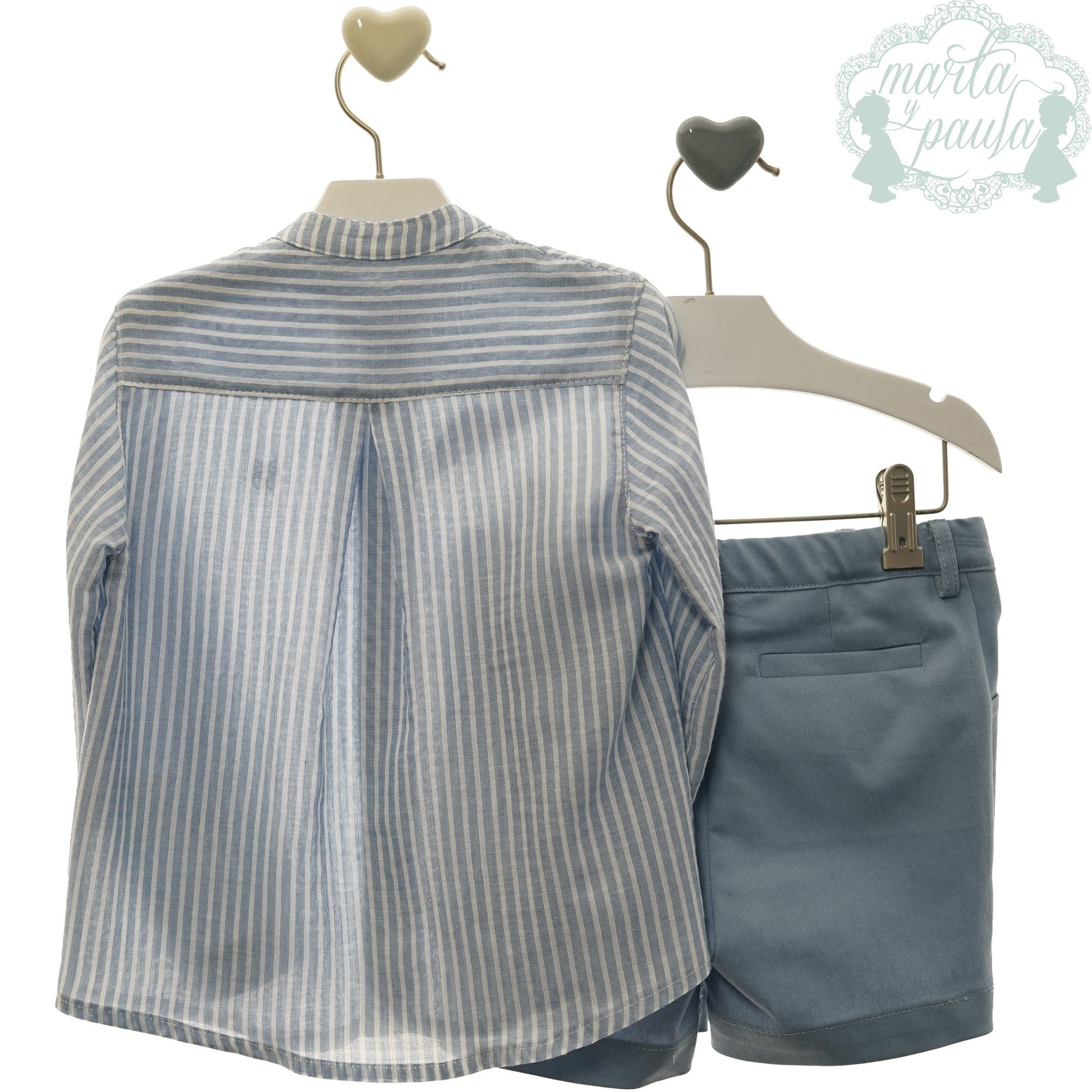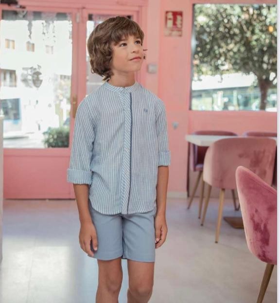 Traje de dos piezas para niño. Camisa cuello mao en estampado de rayas azul empolvado y pantalón corto tipo bermuda en color azul.