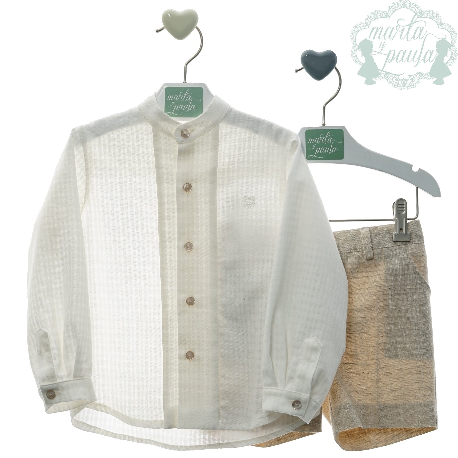 Bonito pantalón en tono tostado y camisa en blanco roto cuello mao con manga larga.