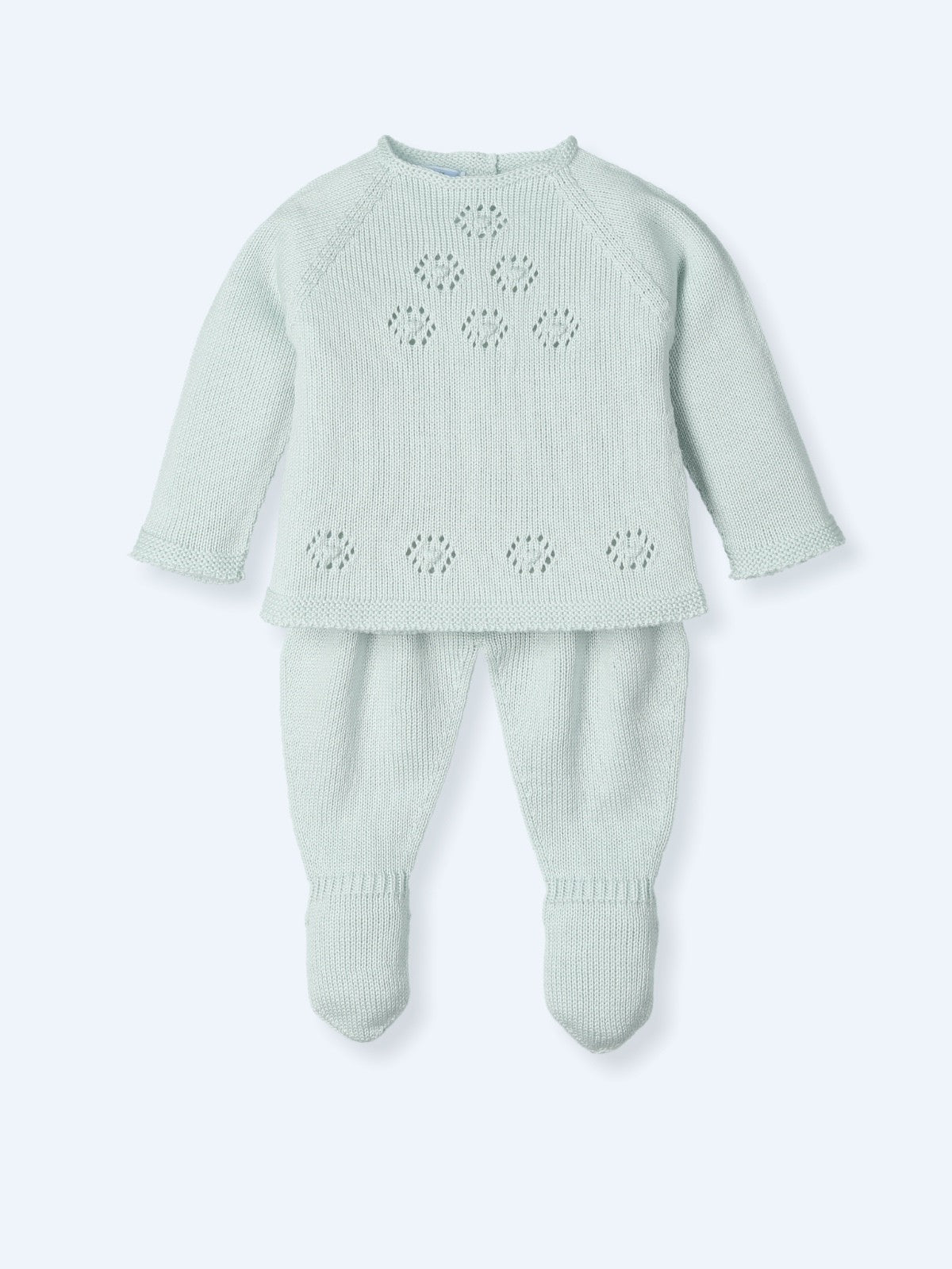 Adornado con calados en los hombros, puños y bajo. Pantalón con pie a juego.