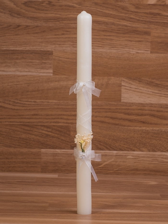 Esta vela de bautizo lisa lleva un original ramillete incorporado.