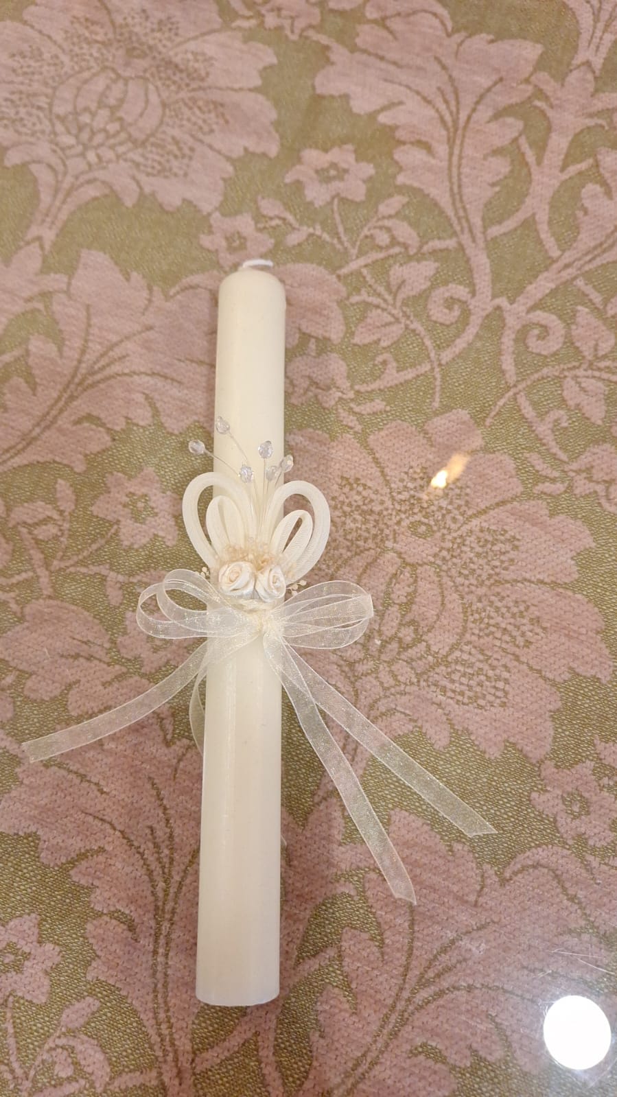 Vela para la ceremonia del bautismo con lazo y flor en tono crudo,
