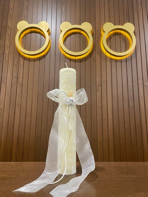 Vela grande para la ceremonia del bautismo con lazo y flor en tono crudo,