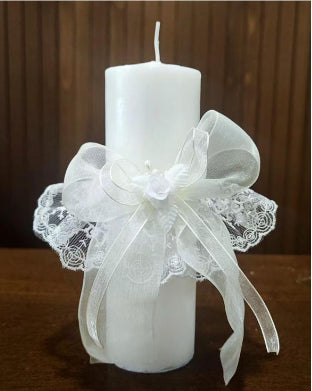 Vela ancha para la ceremonia del bautismo con lazo y flor en tono crudo,