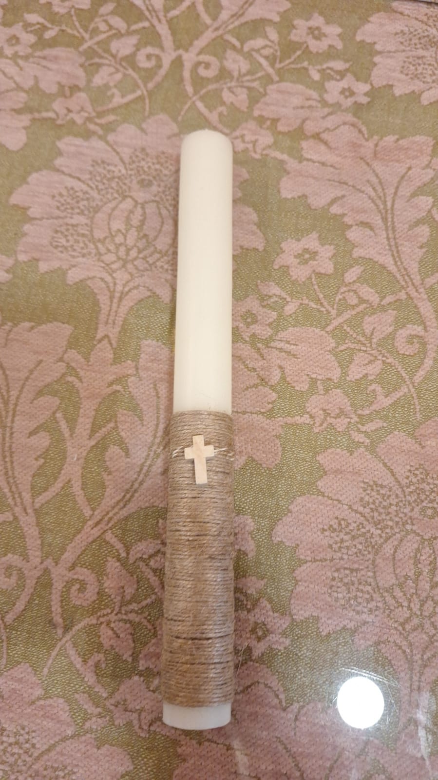 Vela para la ceremonia del bautismo con rafia y cruz en tono crudo. Decorada a mano.