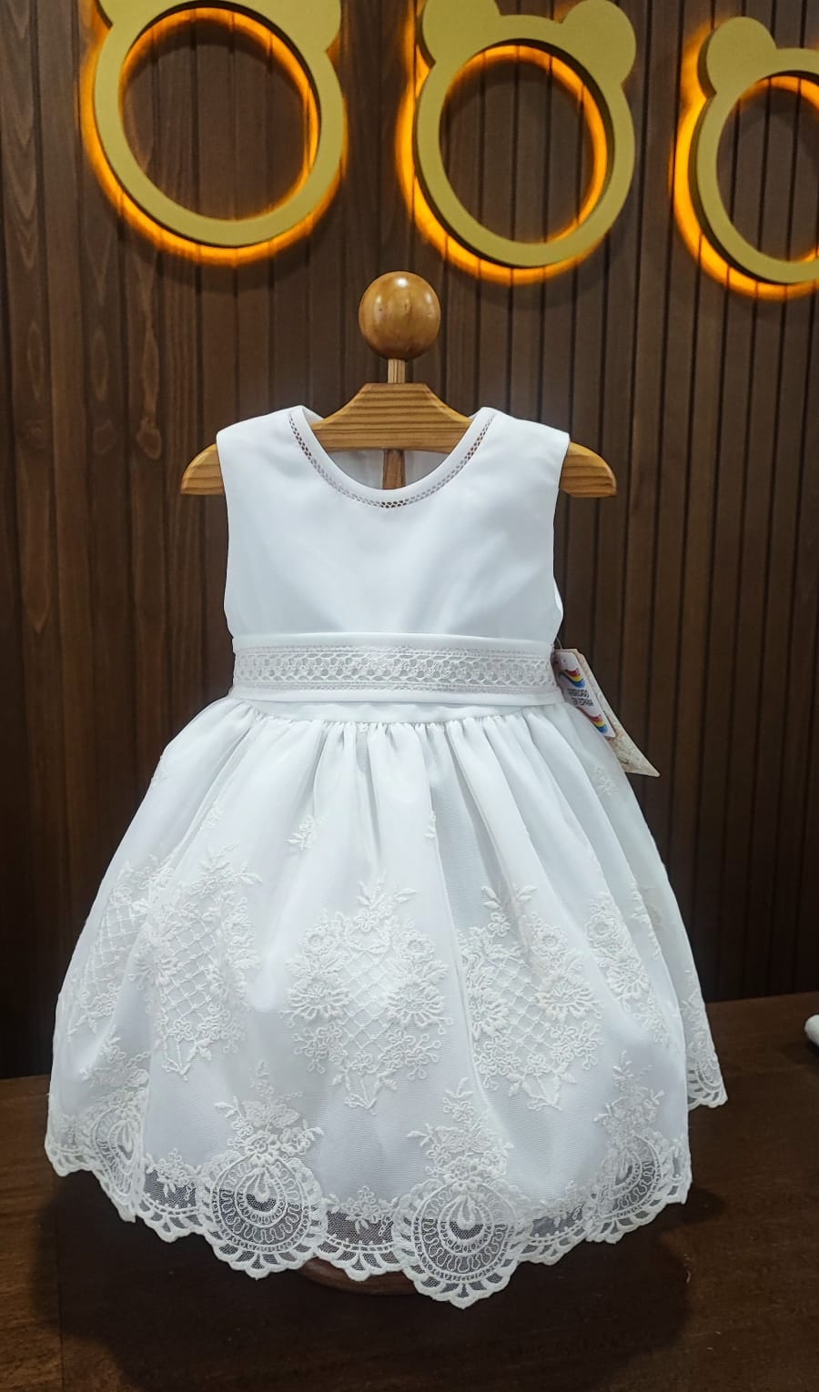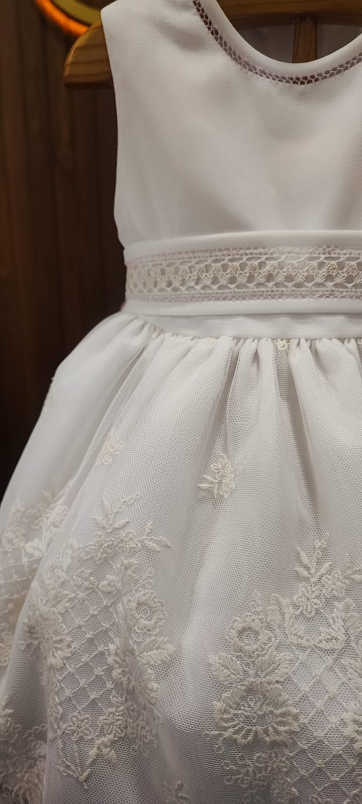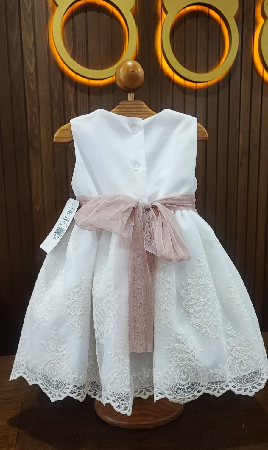 El cuerpo sin mangas y la falda en tul bordada con puntilla en rosa a juego con el fajín de la cintura.
