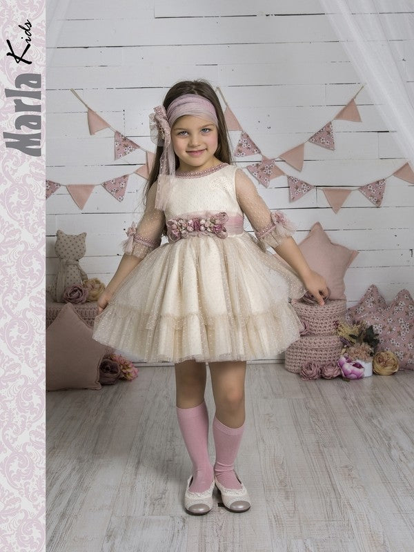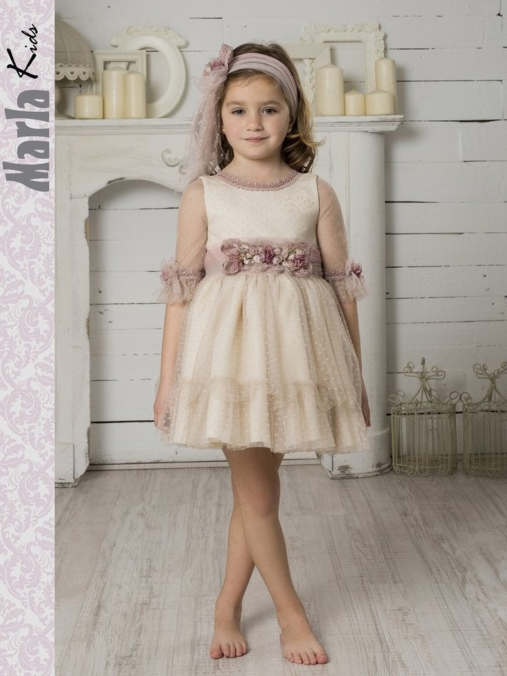 Espectacular vestido corto con manga realizado en tul plumeti de color beige y detalles en tul rosa pastel con espectaculares flores en la cintura.