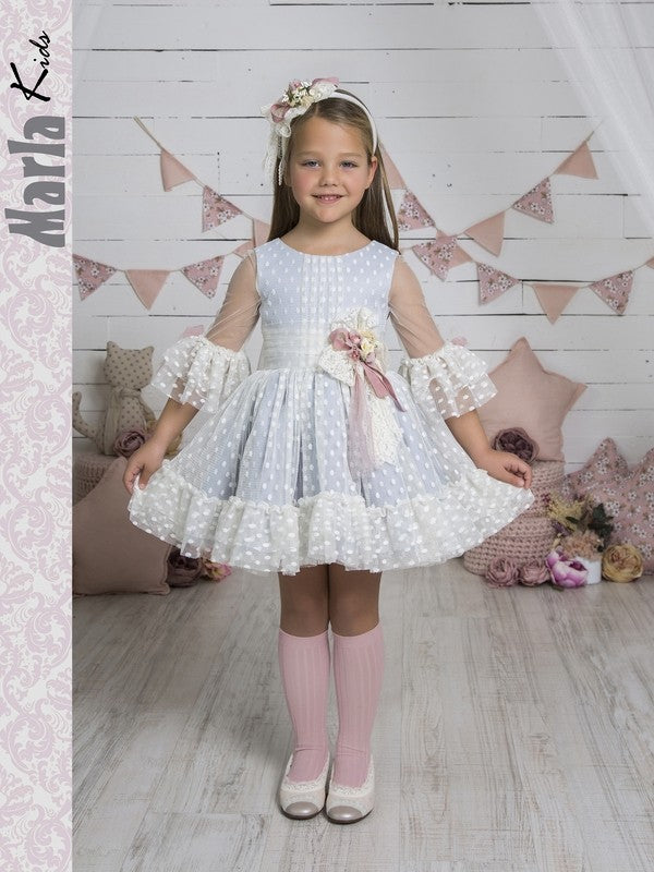 Espectacular vestido corto con manga realizado en tul plumeti de color azul cielo y detalles en tul rosa pastel con espectaculares flores en la cintura.