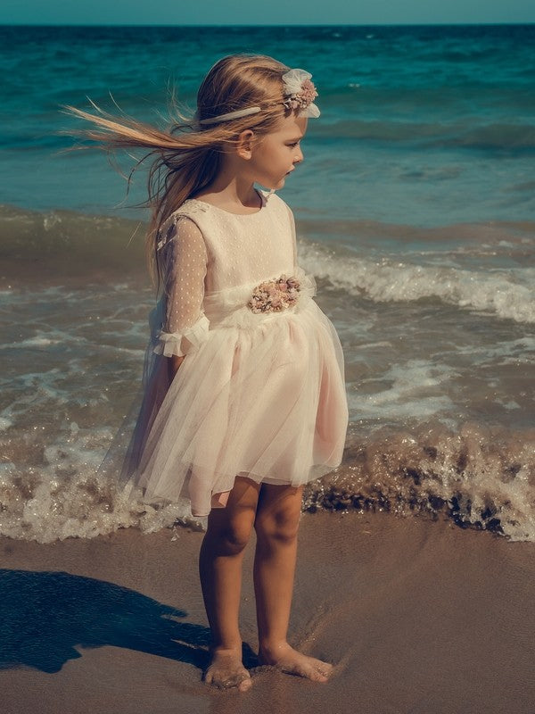 Fabricado en tul plumeti con fondo en color beige con mangas semitransparente al codo terminando en puntilla rizada de color rosa.