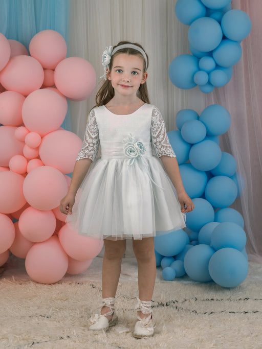 Espectacular vestido corto con manga en tejido de croché realizado en tul de color azul cielo con espectaculares flores en la cintura.