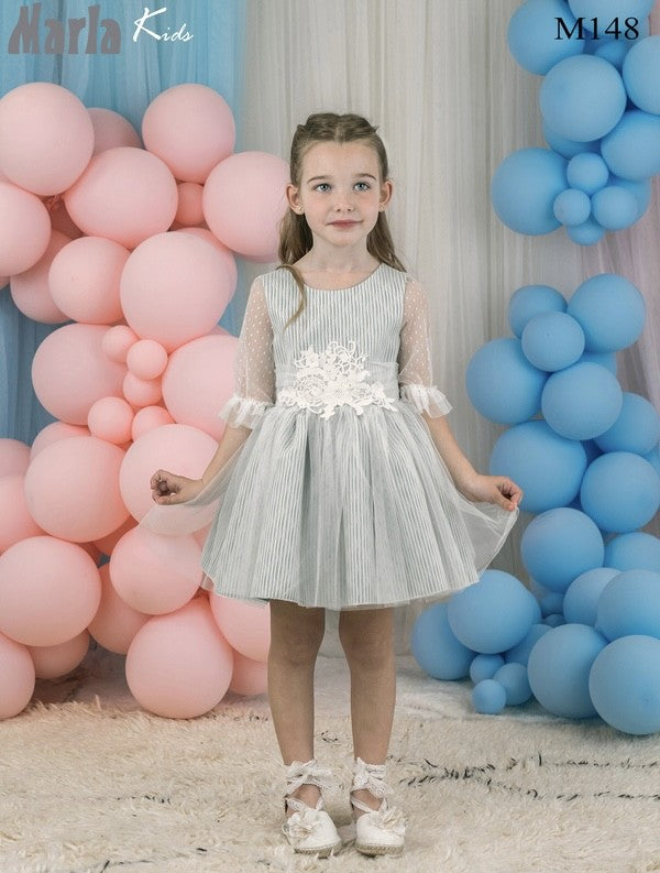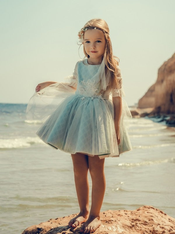 Espectacular vestido corto con manga realizado en tul plumeti de color azul cielo y detalles en tul rosa pastel con espectaculares flores en la cintura.