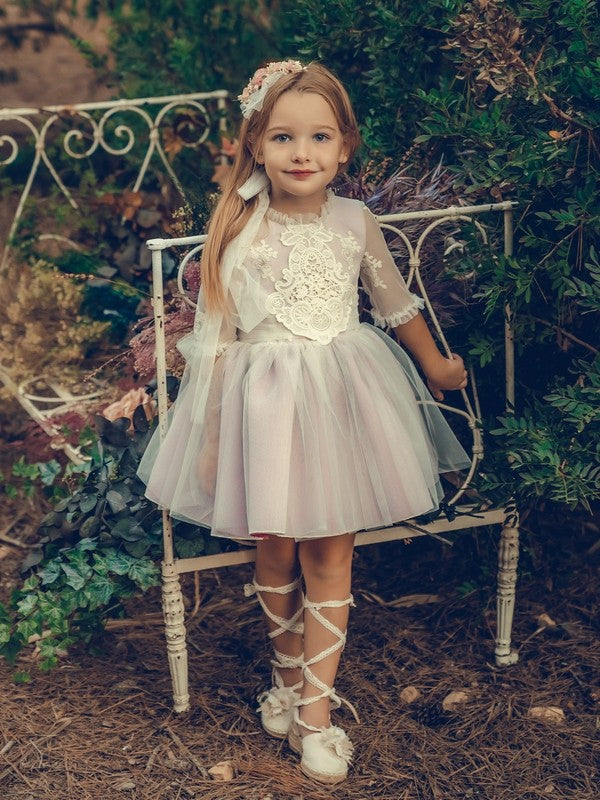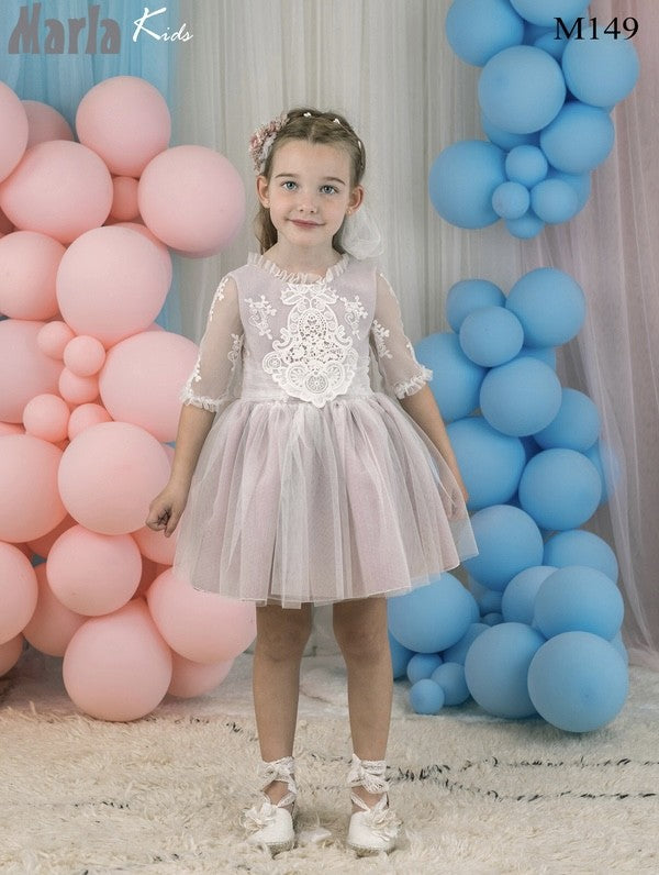 Fabricado en tul con fondo en color rosa con mangas semitransparente al codo terminando en puntilla rizada.