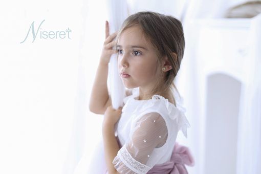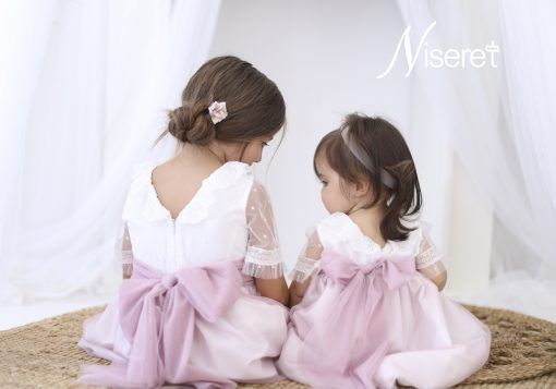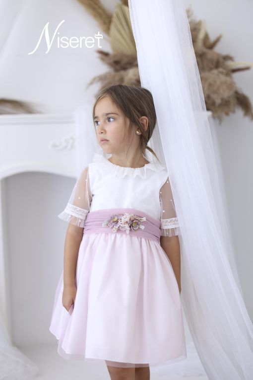 Vestido Ceremonia 2025 Niseret 5618 destaca por su elegante confección en tul bordado de alta calidad, combinando un fondo de color que aporta frescura y vitalidad al diseño. Sus acabados en puntilla bordada confieren un acabado delicado y sofisticado, ideal para ocasiones especiales. Presenta mangas al codo y espalda en V, complementadas por un fajín de tul a tono que realza la silueta de manera sutil. El cuerpo de tul plumeti bordado y los detalles de encaje en escote y mangas dotan al vestido de un aire romántico y atemporal. La falda vaporosa en tul rosa está disponible en varios colores para adaptarse a distintos gustos y estilos.