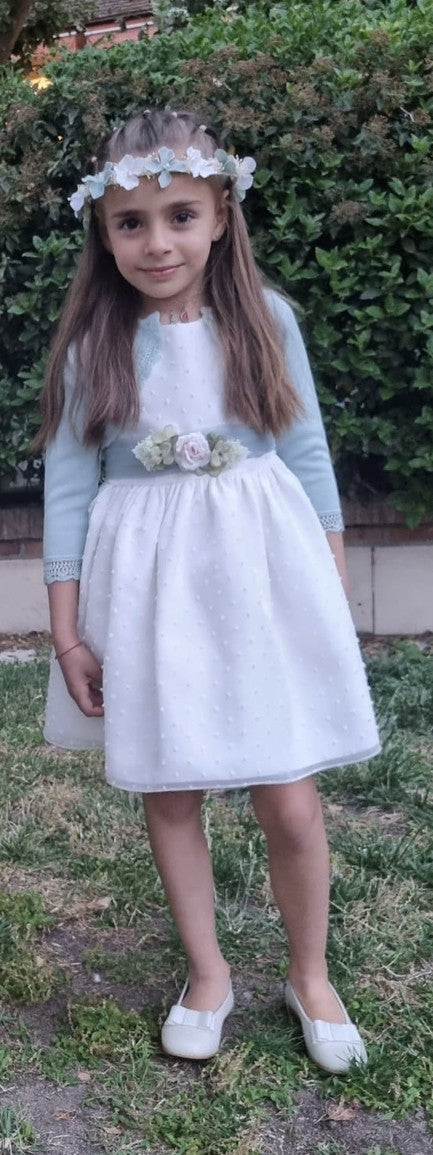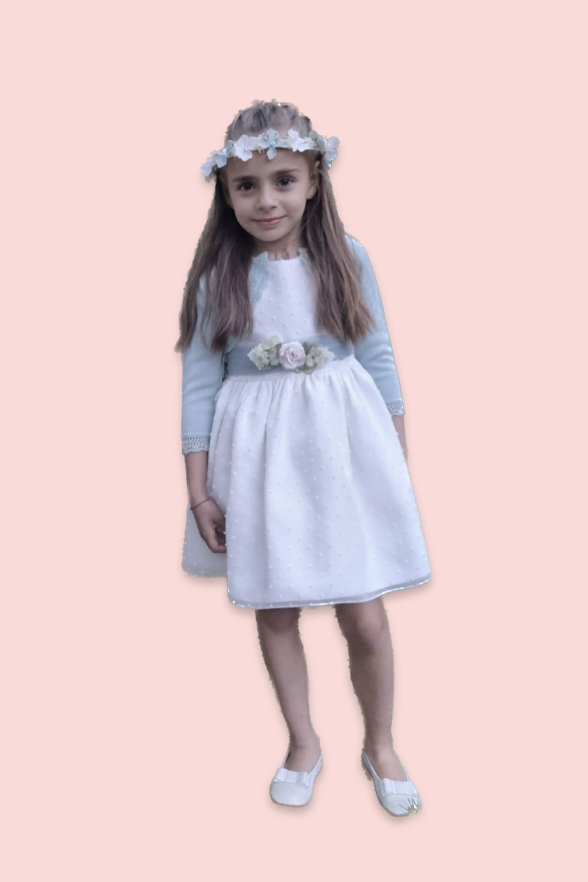 El cuerpo liso sin mangas con fajín de tul en la cintura decorado con flores.