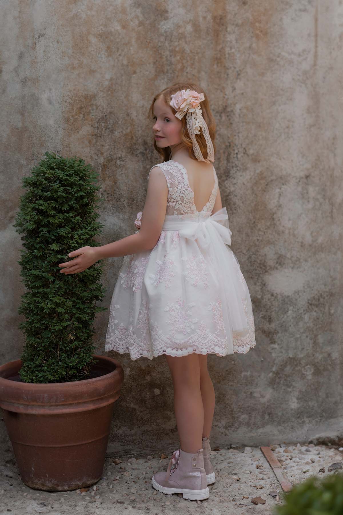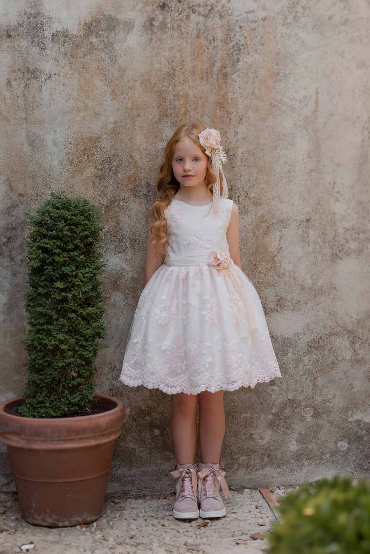 El cuerpo en tul bordado sinn mangas y falda a media pierna del mismo tejido