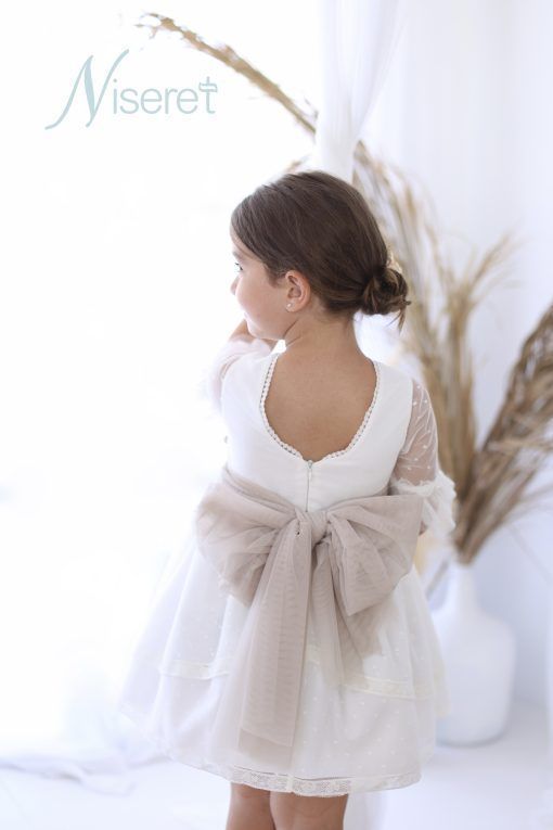 Vestido Ceremonia 2025 Niseret 5619 es una prenda exclusiva que destaca por su elaboración artesanal en España y materiales de alta calidad. Confeccionado en tul plumeti, presenta una doble falda que aporta volumen y movimiento elegante. Su escote está decorado con delicados topos bordados, mientras que las mangas, realzadas con encaje de guipur, suman un toque sofisticado y refinado. Ideal para eventos especiales, este vestido permite personalización mediante un fajín de tul disponible en varios colores y un adorno de flores artesanal que puede añadirse a la lazada, garantizando un acabado único y detallista que marca la diferencia.